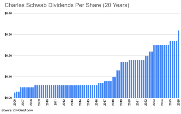 Over the last 20 years, Charles Schwab has averaged almost 12% dividend growth each year.