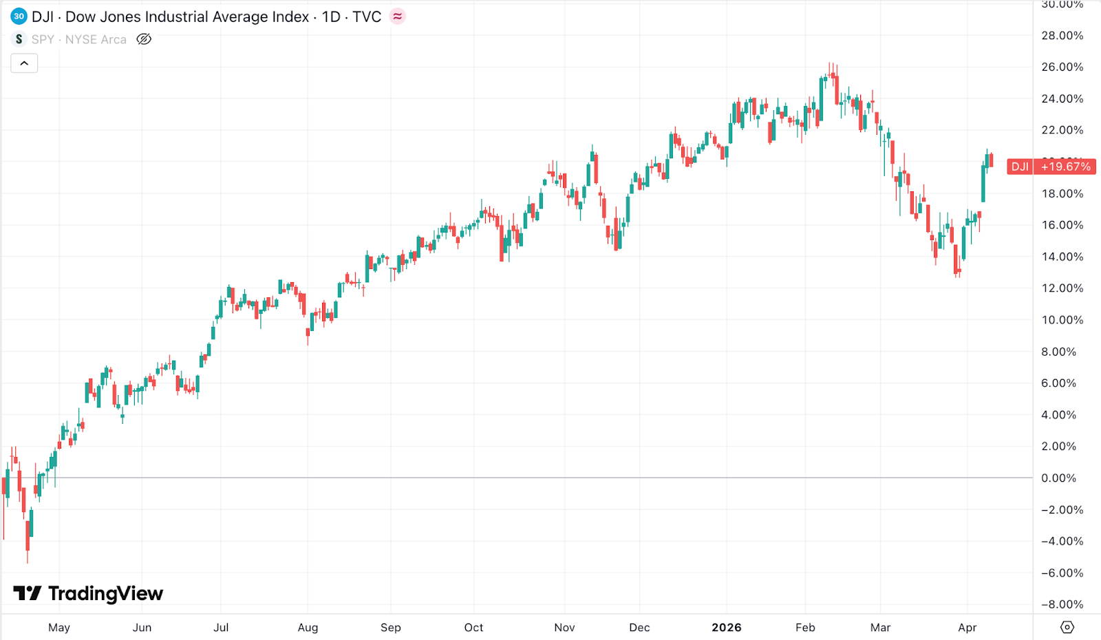 First, despite the tough 2026, the Dow is still up almost 20% since last April.