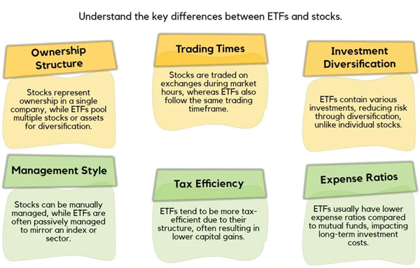 Understanding these differences helps investors choose between the broader market exposure of ETFs and the targeted approach of individual stocks, each with its own set of costs, risks, and potential returns.