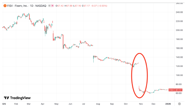 In October, Fiserv’s stock price fell over 40% following a terrible earnings report.