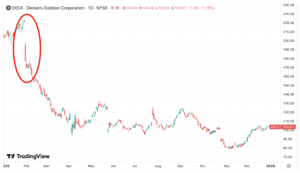 Unlike Trade Desk and Fiserv, Deckers’ damage happened at the beginning of the year.