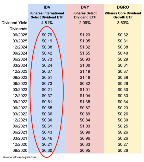 IDV has a great 4.8% dividend yield, which is higher than some of iShares’ U.S. Dividend ETFs like the iShares Core Dividend Growth ETF (ticker: DGRO) and iShares Select Dividend ETF (ticker: DVY).