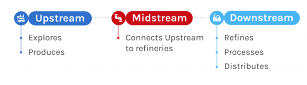 The energy sector is divided into three subsectors. Upstream energy companies drill for oil and gas. These companies receive a lot of attention because commodity prices drive their business results. Midstream is the transportation and storage of energy commodities. These companies operate pipelines, storage facilities, and terminals.