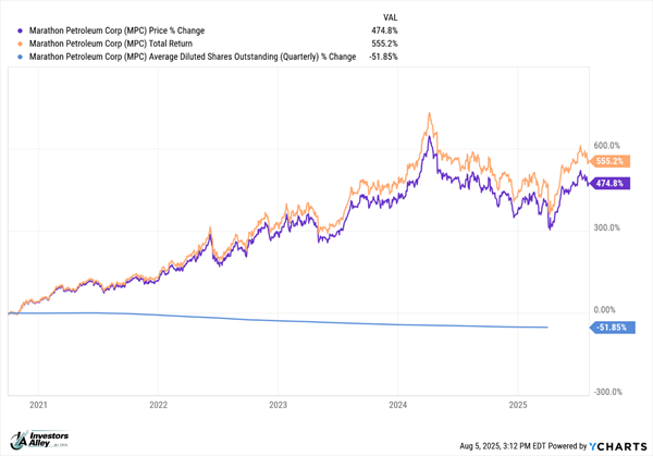 Marathon’s returns have been driven by steady 10% annual dividend growth and the company’s buyback of outstanding shares, which automatically boosts net income per share. The dividend has increased by 57% over the last five years, while the number of shares outstanding has decreased by 52% during the same period. This chart shows the five-year share price and total returns for MPC. Yes, investors earned 555% over the last five years.