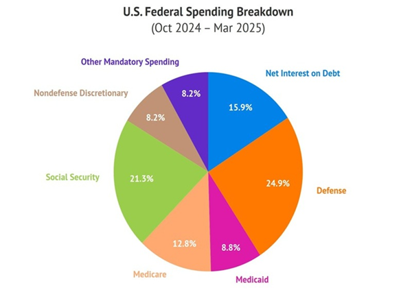 The net interest on our debt continues to climb. Defense spending seems “secure” given the current state of the world. Which leaves the modest nondefense discretionary slice, just 8.2% of the federal spending pie for DOGE to slice from:
