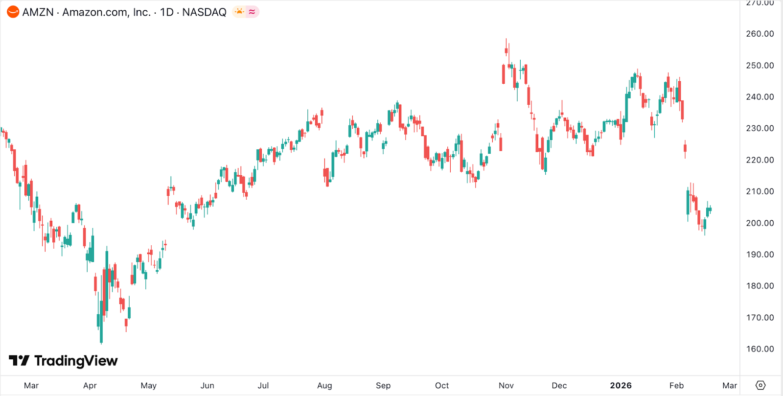 So far, Amazon’s stock has fallen almost 15% since the calendar changed to February.