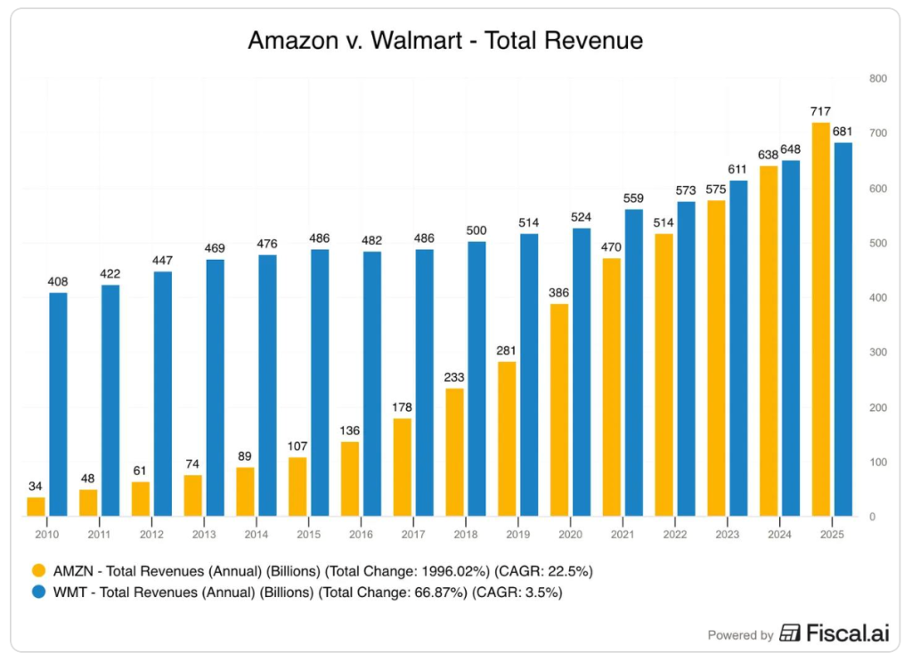15 years ago, Walmart had more than 10x Amazon’s revenue.
