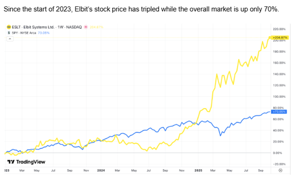 Since the start of 2023, Elbit’s stock price has tripled while the overall market is up only 70%.